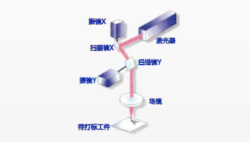 將激光束入射到兩反射鏡(掃描鏡)上,用計算機控制反射鏡的反射角度,這兩個反射鏡可分別沿X、Y軸掃描,從而達到激光束的偏轉,使具有一定功率密度的激光聚焦點在打標材料上按所需的要求運動,從而在材料表面上留下永久的文字或圖形。