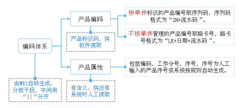 航天產品種類多樣、數量巨大,相應的標識零件的工作量也很大。為了減輕工作量必須要對零件進行科學的分類。結合產品生產管理狀況,產品的生產體系如圖所示。編碼由產品編碼和產品屬性組成, 第一段是產品編號, 即產品標識碼, 供軟件讀取, 按單件標識的產品編號取序列碼, 序列碼和工藝過程卡均由MES自動生成。